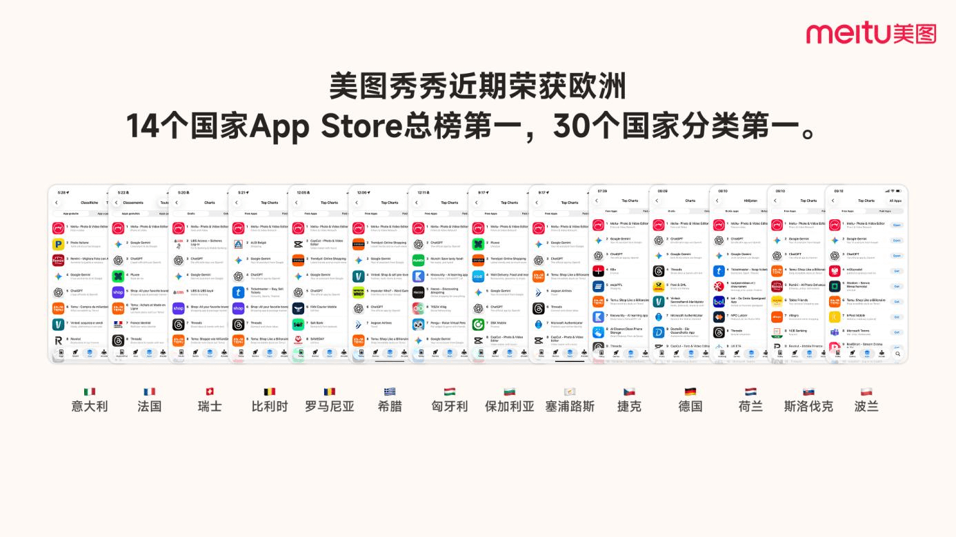 美图秀秀”AI合照”功能风靡欧洲,取得14国应用商店总榜第一