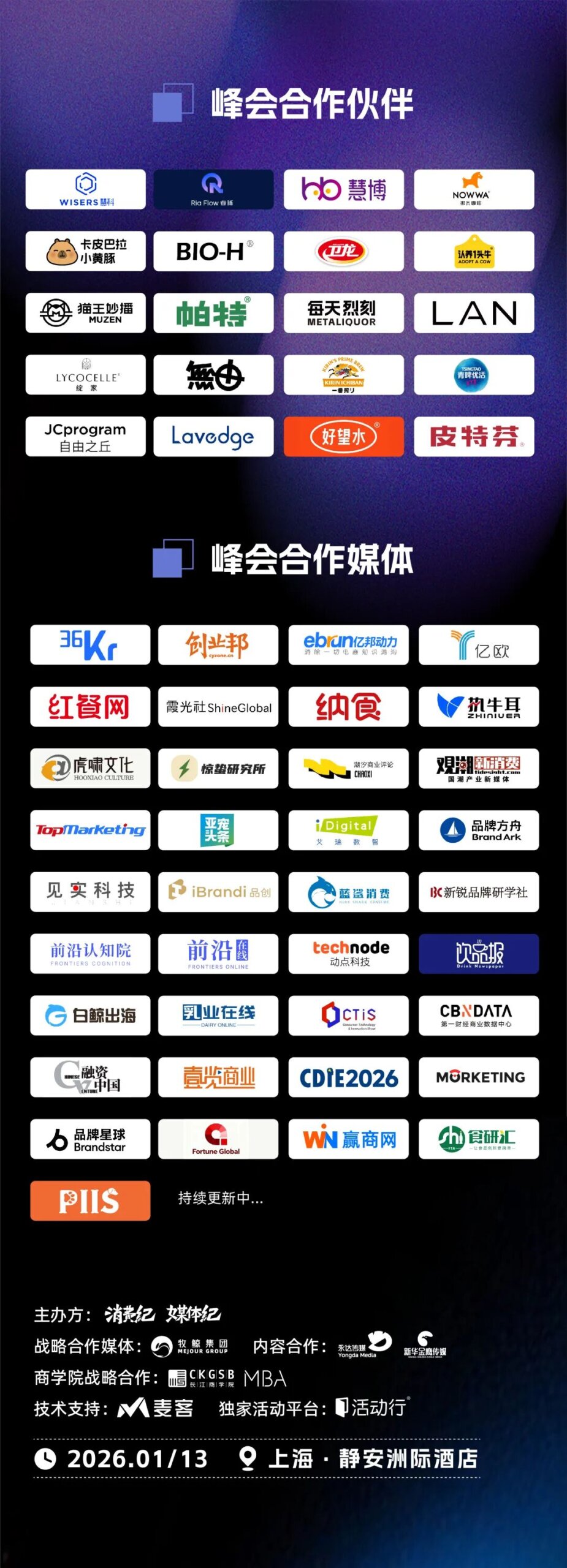 无论你是消费赛道的创业者、从业者还是投资者,都能从这场汇聚了新零售、新消费、营销传媒全链条顶尖操盘手的峰会中,汲取前沿的行业思维与实战的增长智慧,精准捕捉消费市场的全新机遇。