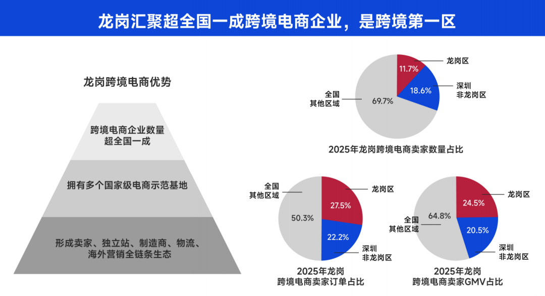 在此次发布的《龙岗跨境电商发展指数》中,清晰呈现了龙岗跨境电商的体量优势:2025年,全区跨境电商企业数量已占全国总量的11.7%;此外龙岗跨境电商企业订单量和总GMV也分别占全国总量的27.5%、24.5%,三项核心指标稳居全国前列。