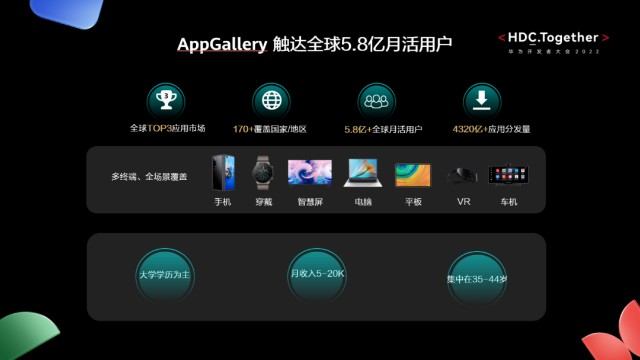 作为TOP3的移动应用生态,华为HMS生态覆盖了170多个国家和地区的5.8亿月活用户,全球开发者注册总数达600万。