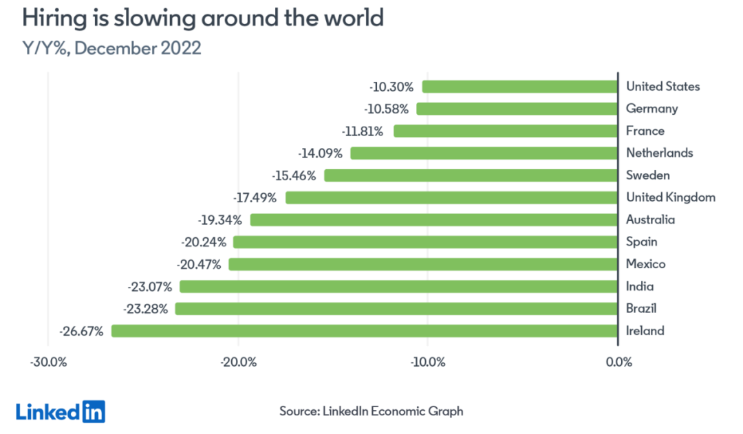 近来,“谨慎招聘”已经成为一项全球趋势。领英提供的一份最新全球人才市场洞察显示,去年12月,几乎所有国家的招聘活动都呈现同比下降趋势。