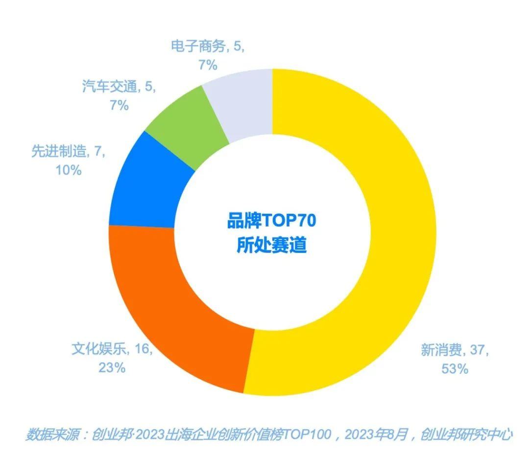 本次出海品牌上榜企业的一级行业分布中,新消费占比最多,约53%,消费领域这两年在出海市场也涌现出很多创新模式、品类和渠道,传统消费企业寻求转型继续占取存量市场,新兴消费企业不断扩大增量市场份额;其次,作为经典出海赛道,文娱企业数量占比23%。