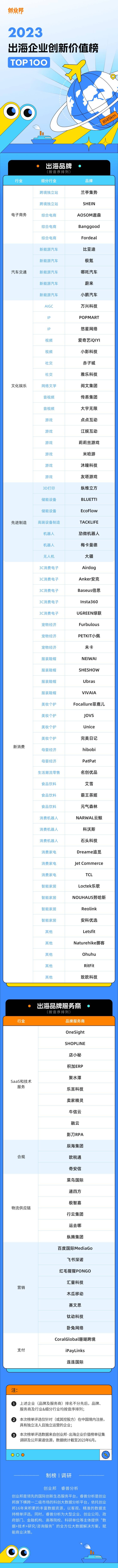 本次榜单分为出海品牌和出海品牌服务商两大类。其中,70家出海品牌分布于新消费、先进制造、电子商务及汽车出行等热门行业;30家品牌服务商包含SaaS和技术服务、营销、物流供应链等备受关注的领域。