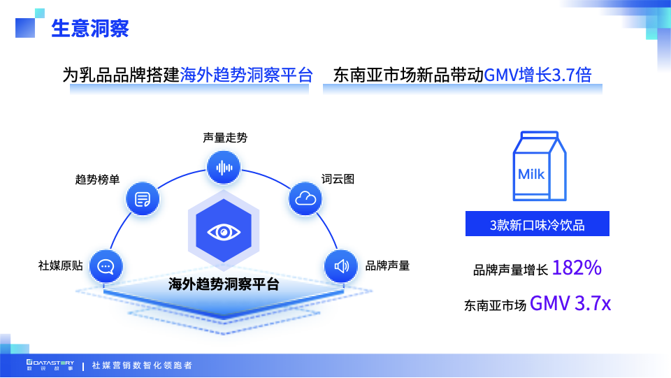 在东南亚市场,数说故事帮助某冷饮品牌搭建了海外趋势洞察平台,该品牌的3款适合本土化风味的冷饮,驱使品牌在东南亚市场声量猛增182%,GMV增长3.7倍。
