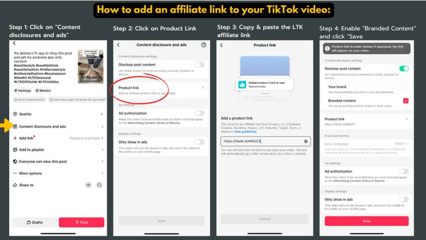 创作者不仅是在推荐产品,更是在帮助消费者发现、了解并最终选择购买。根据 TikTok 的全球零售数据报告,创作者通过娱乐内容实现带货。数据显示,49% 的 TikTok 用户会在平台上发现新品牌或产品,35% 的用户表示曾在 TikTok 学到新知识,29% 的用户则将其视为灵感来源。 - 创作者可在“Content disclosure and ads内容披露与广告”中添加 LTK 联盟链接