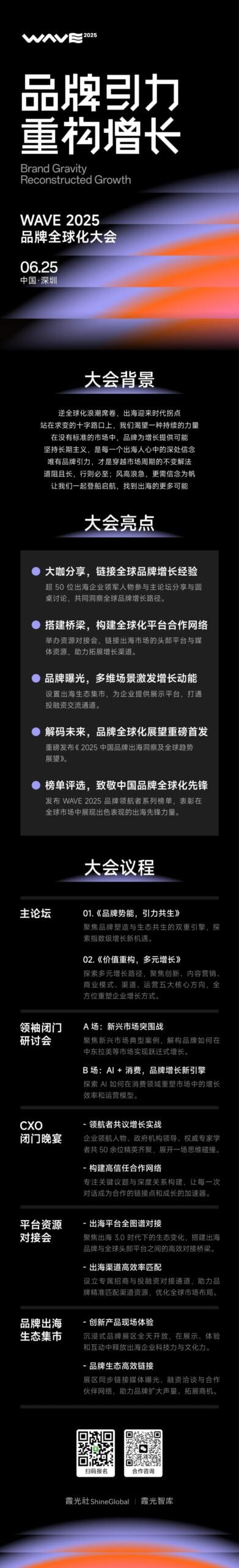 6月25日,霞光社将在深圳举办“品牌引力·重构增长 – WAVE2025品牌全球化大会”,大会集结品牌全球化领航者、投资机构、海内外头部媒体,旨在分享中国品牌在海外市场取得成功的经验和策略,共同探讨全球市场格局和产品增长方法论,助力中国品牌在全球市场变化中实现品牌革新与价值增长。