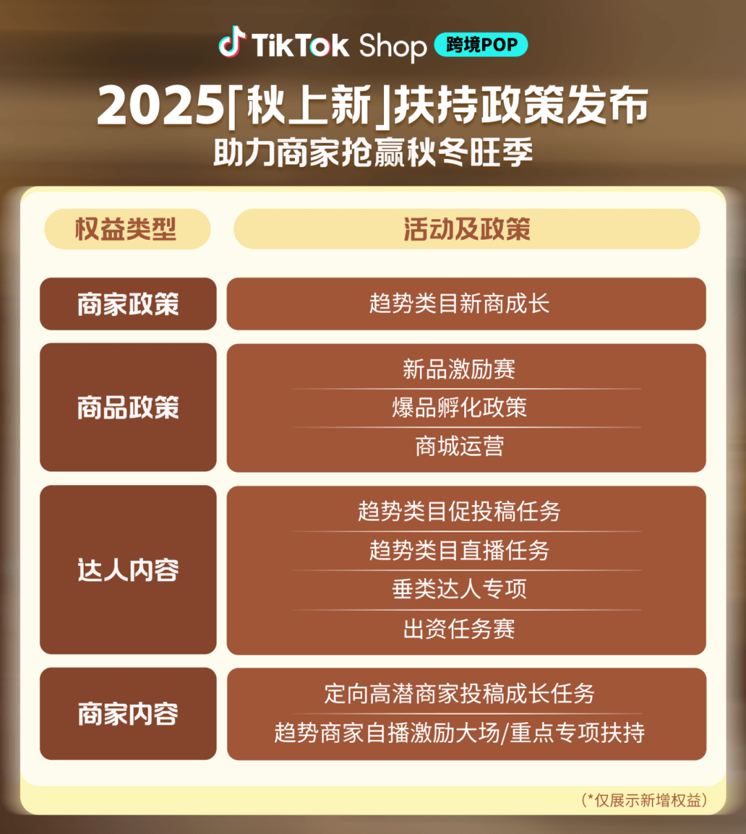 除原有美区POP政策支持外,TikTok Shop倾力加码9月「秋上新」,助力趋势类目商家全面成长,进一步强化了商家政策、商品政策、商家内容、达人内容、营销、机制等板块,助力女装及内睡、男装及内睡、运动户外、美妆个护、时尚配饰、鞋类、纺织及家居软装、箱包、珠宝配饰、童装、民族服饰等趋势类目商家实现全方位的生意增长。